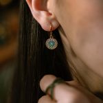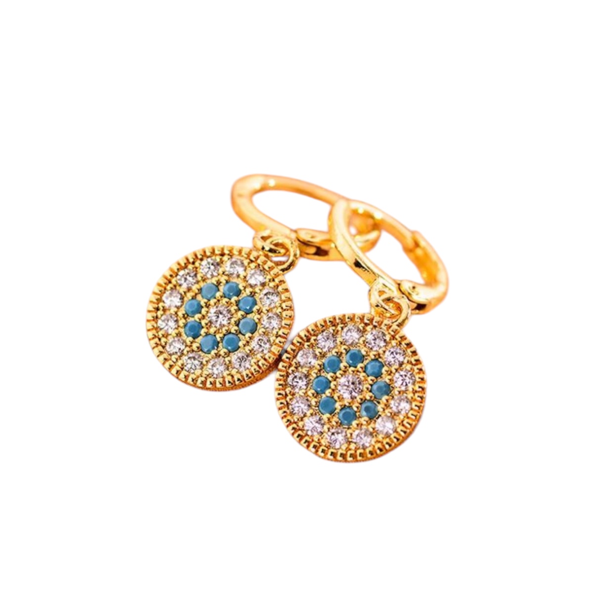 Σκουλαρίκια κρίκοι αυτιών σε χρυσό χρώμα με κρεμαστό στοιχείο . Στολισμένα με λευκά και τυκουαζ στρας. Ένα κόσμημα που θα σας εκπλήξει και θα το λατρέψετε.